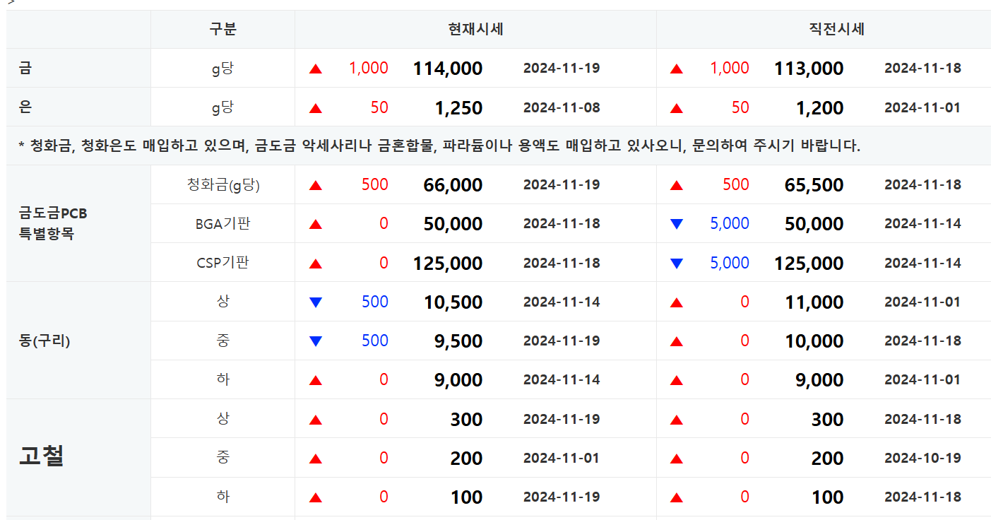 오늘 기준 고철시세는 다음과 같습니다.
